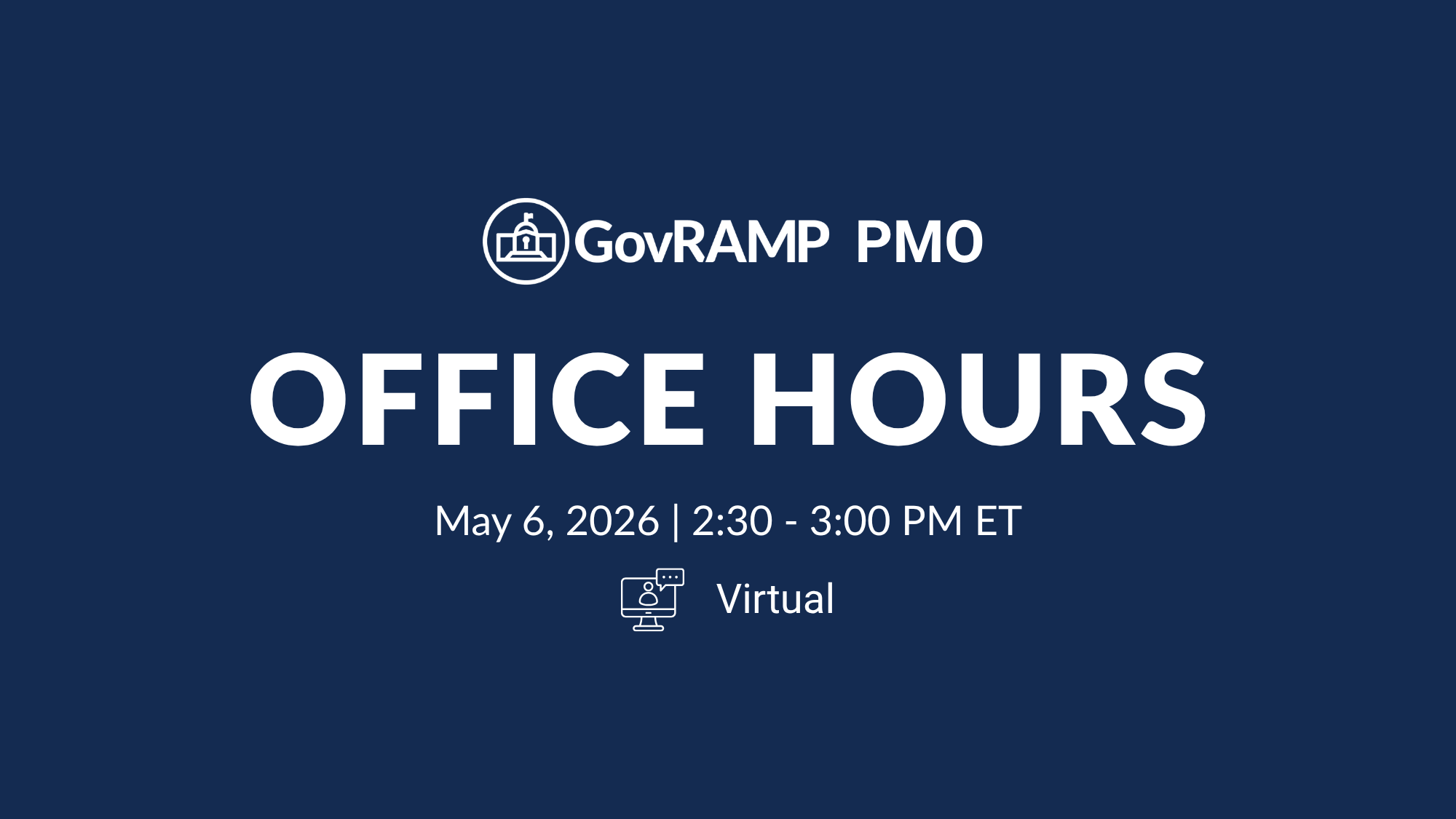 Join the GovRAMP Program Management Office (PMO) for a live virtual session designed as an open forum to support your questions and engagement. Whether you are navigating the authorization process, preparing for assessments, or seeking clarity on GovRAMP requirements, this 30-minute session is an opportunity to connect directly with GovRAMP staff.